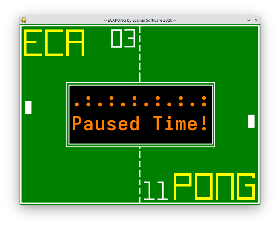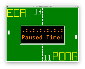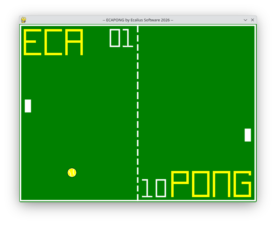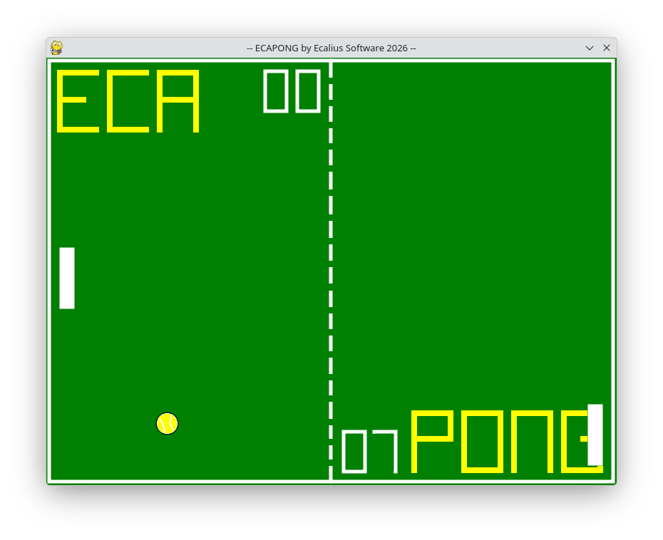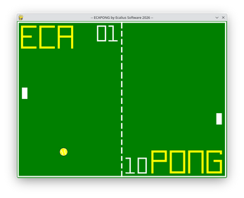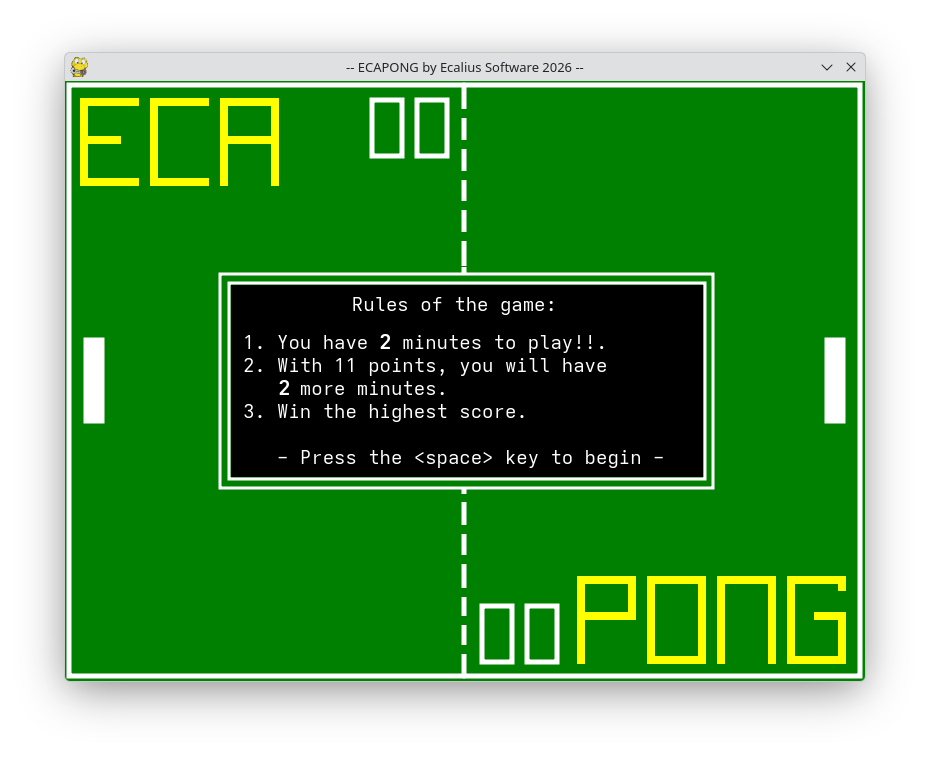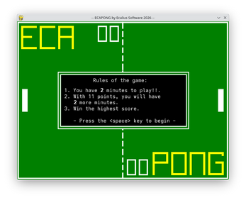 ECAPONG, es la recreación personal del clásico juego de ATARI "PONG", programado en Python 3.14.3, con las librerías Pygame 2.6.1, para las plataformas : Linux, Windows, o MAC OS, y cualquier plataforma que tenga instalado Python, y las librerías mencionadas. Domina el arte del PONG, con "power ups", y recuerda sólo tienes 2 minutos para vencer, cada 11 puntos volverás a tener tiempo, pero si pasas de los 99 puntos volverás a tener 0, y tu oponente ganará, asi que también tiene su estratégia. Diviértete de lo lindo, recordando viejos arcades de los 80!!. Dentro del ZIP, está el código fuente, para que veas cómo está realizado. He usado una "AI" llamada RAPHAEL, para crear la pantalla de presentación, todo lo demás ha sido creado por mí.