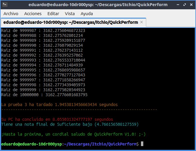 QuickPerform, es una aplicación programada en Python versión 3.12.3, para evaluar el rendimiento de su PC, de una manera rápida y sencilla, a través de la terminal. Funciona si tienes Python instalado, tanto en Windows, Linux o Mac.